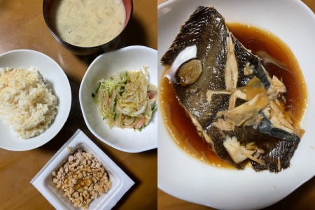 発芽玄米ご飯60g、ひきわり納豆、味噌こんにゃく、サラダ(レタス、きゅうり)