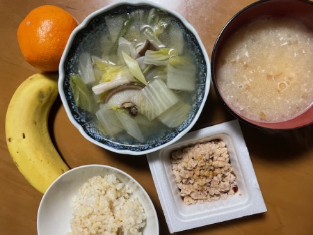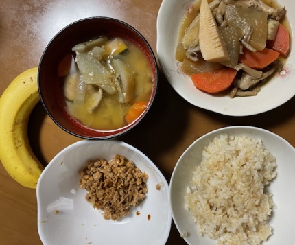 発芽玄米ご飯40g、納豆、豚汁、煮物、バナナ