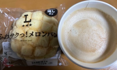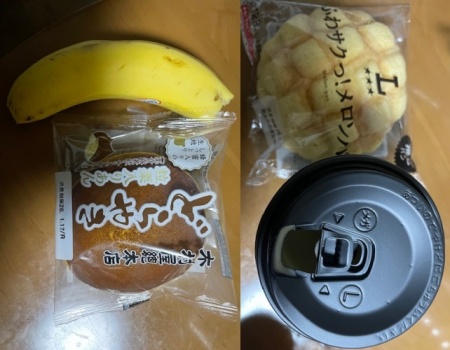 バナナ、ホットカフェラテL、メロンパン、ミルク飴