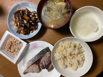 発芽玄米ご飯40g、ひきわり納豆、味噌汁(キャベツ)、切り干し大根、白菜の漬物、おでん