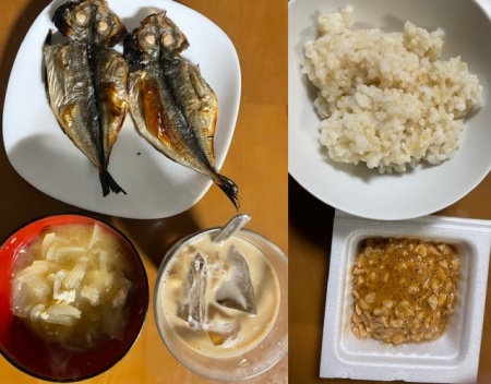 発芽玄米ご飯40g、ひきわり納豆、味噌汁(玉ねぎ)、アジの開き、アイス豆乳ラテ、バナナ、みかん