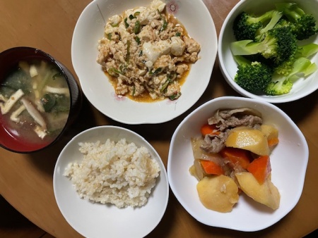 発芽玄米ご飯40g、ひきわり納豆、麻婆豆腐、肉じゃが、味噌汁、ブロッコリー、バナナ、アイス豆乳ラテ