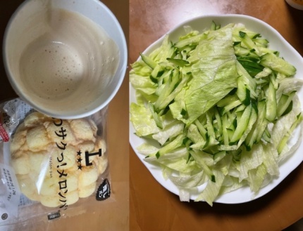 メロンパン、ホットカフェラテM、サラダ(きゅうり、レタス)
