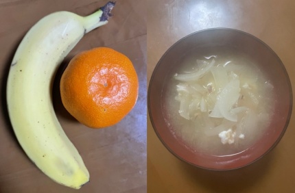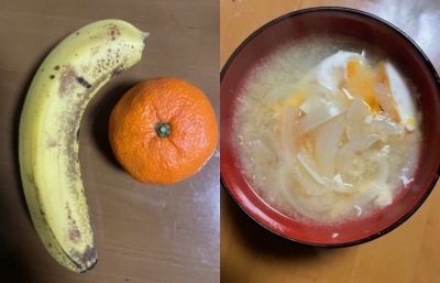 バナナ、みかん、味噌汁(玉ねぎ、卵)