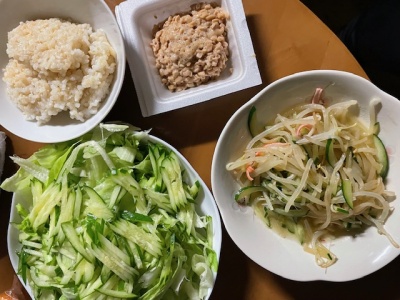 発芽玄米ご飯40g、ひきわり納豆、サラダ(レタス、きゅうり)、もやしのサラダ